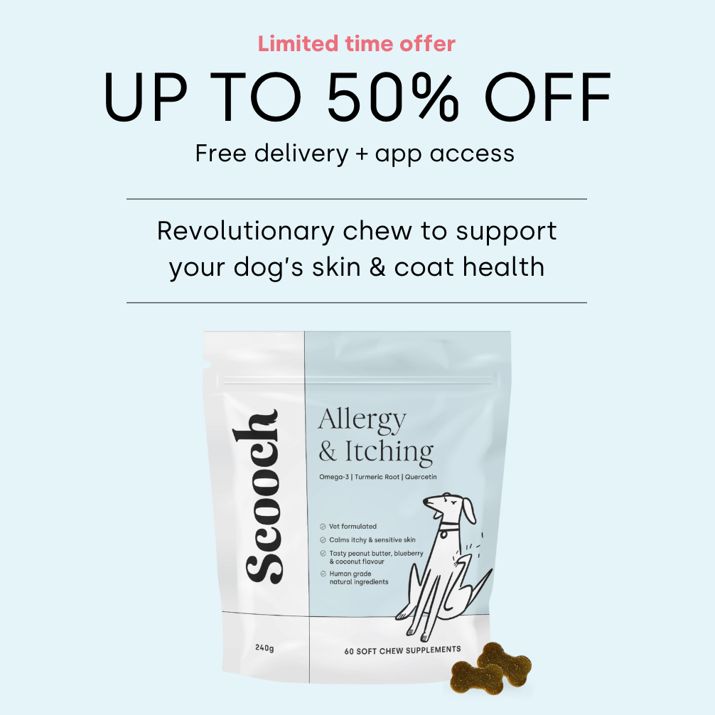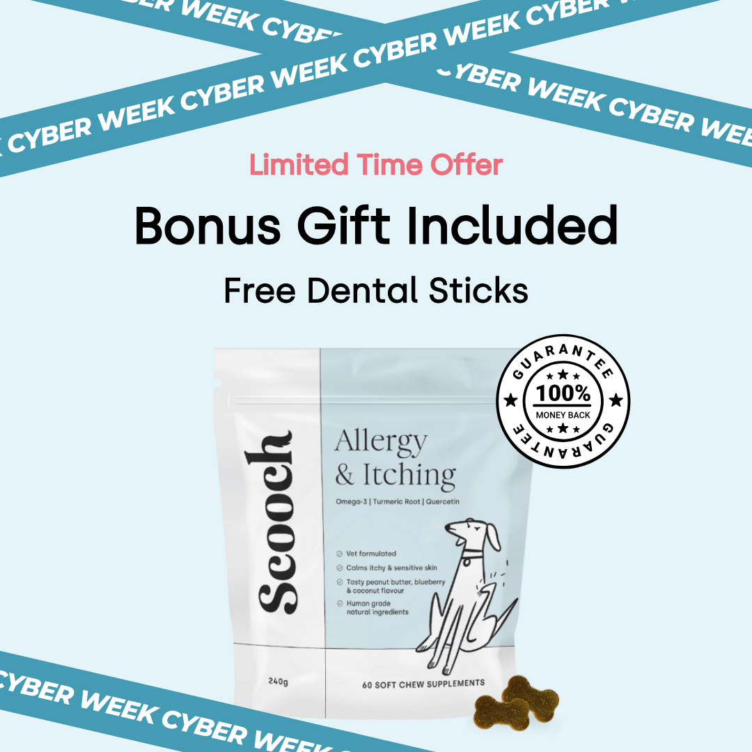 Scooch’s Allergy chews have been vet formulated to provide a clinically proven blend of  ingredients to help stop itching, ear shaking and paw chewing. The ingredients in these tasty daily chews are 100% natural, human grade, plant-based, hypoallergenic and low fat to provide the best quality for your dog.