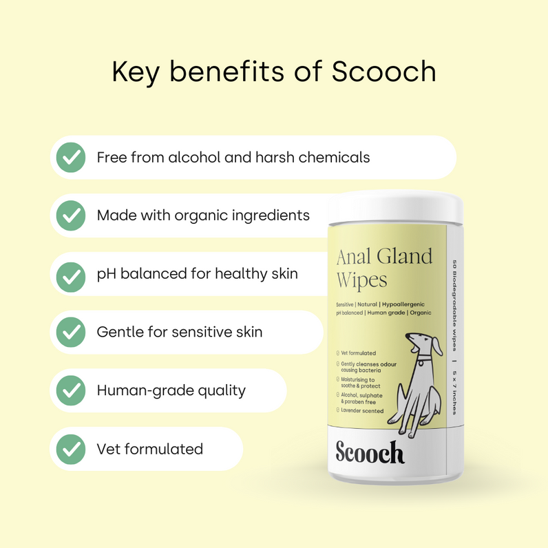 Keep your pup fresh, clean, and comfortable with our vet-formulated Anal Gland Wipes. Made with natural, organic, and hypoallergenic ingredients, these gentle wipes feature mild cleansers to remove dirt and odour-causing bacteria, while a moisturising, pH-balanced formula soothes and protects delicate skin. Infused with lavender to neutralise unpleasant smells, they’re anti-bacterial, anti-fungal, and even anti-viral—providing complete care without sulphates, parabens, harsh chemicals, or alcohol. Easy to use anytime, anywhere—no water needed.