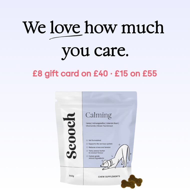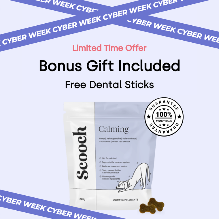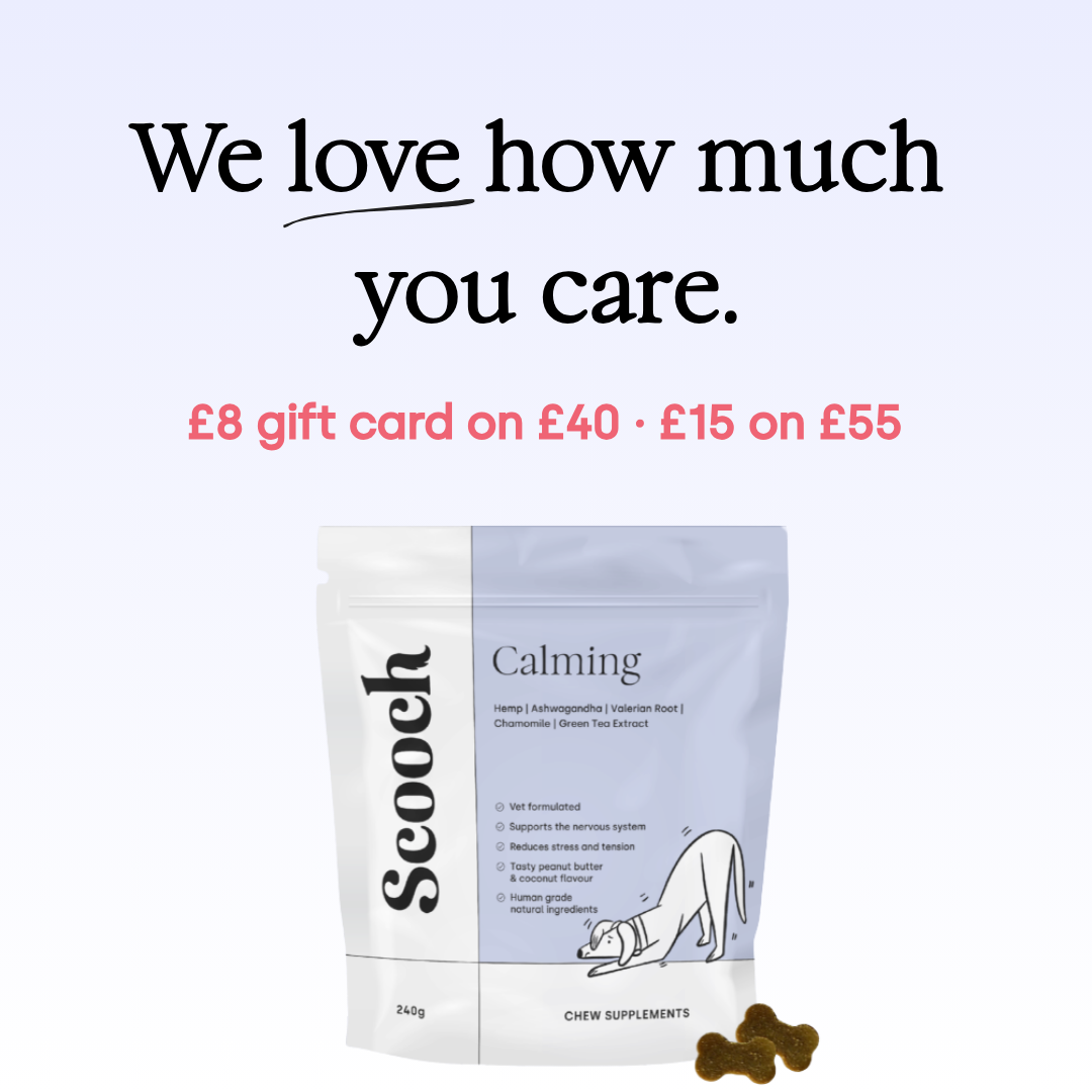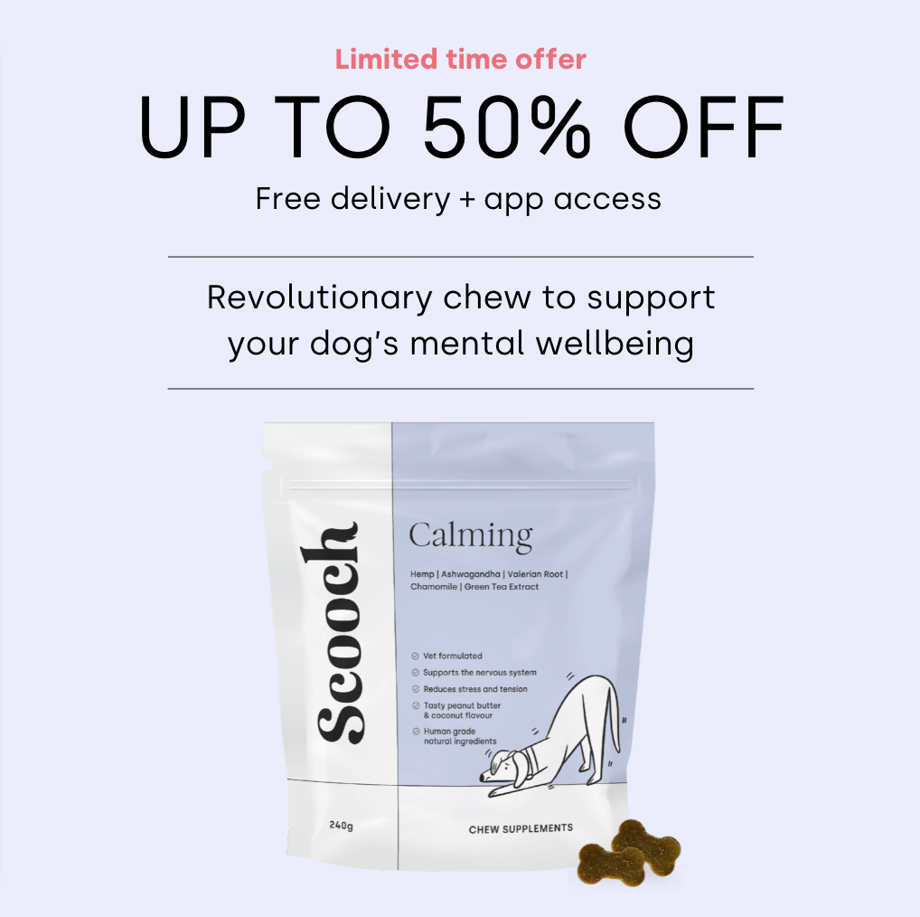 Scooch’s Calming chews have been vet formulated to provide a clinically proven blend of ingredients to help your dog’s mental wellbeing. The ingredients in these tasty daily chews are 100% natural, human grade, plant-based, hypoallergenic and low fat to provide the best quality for your dog.