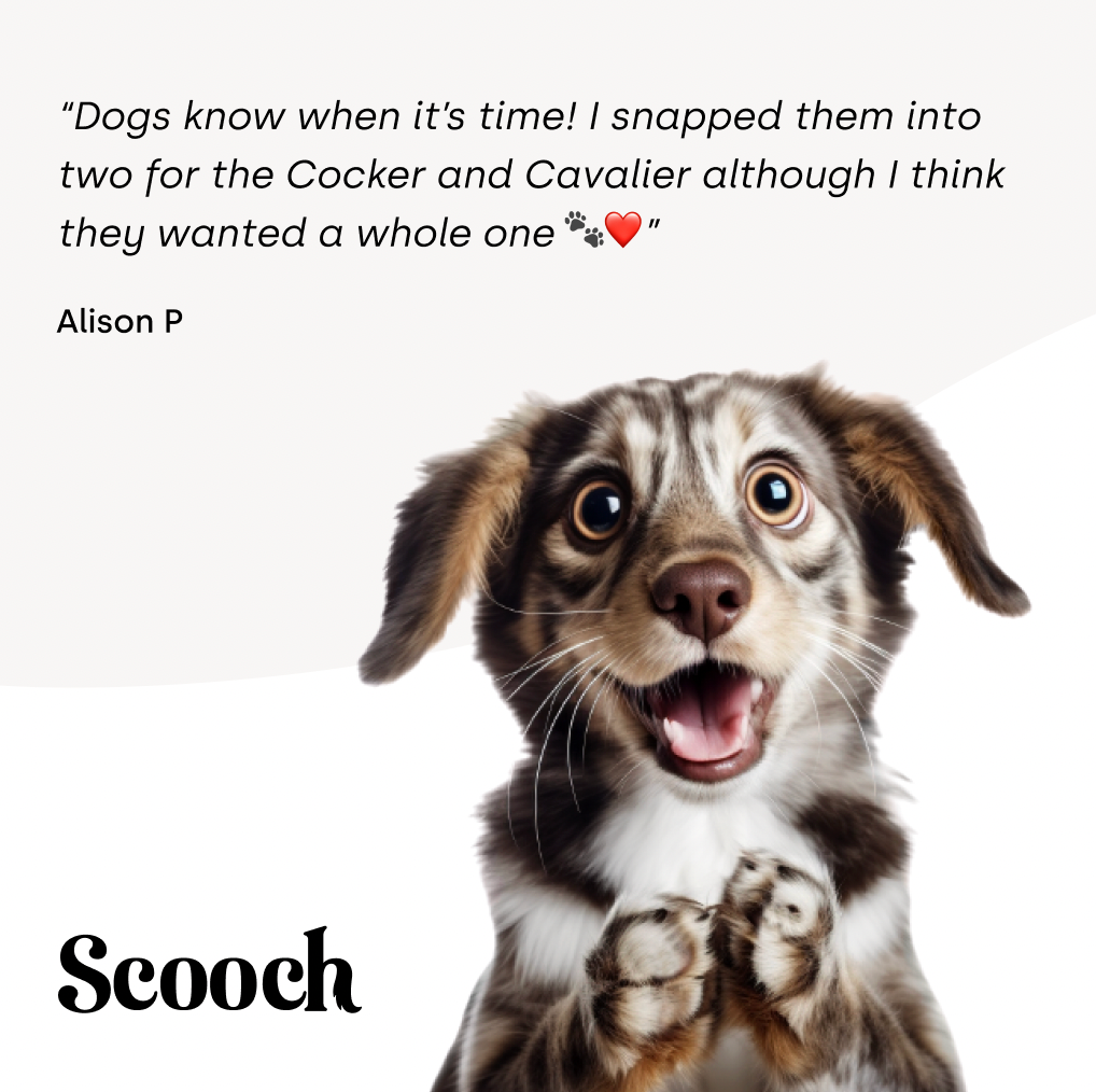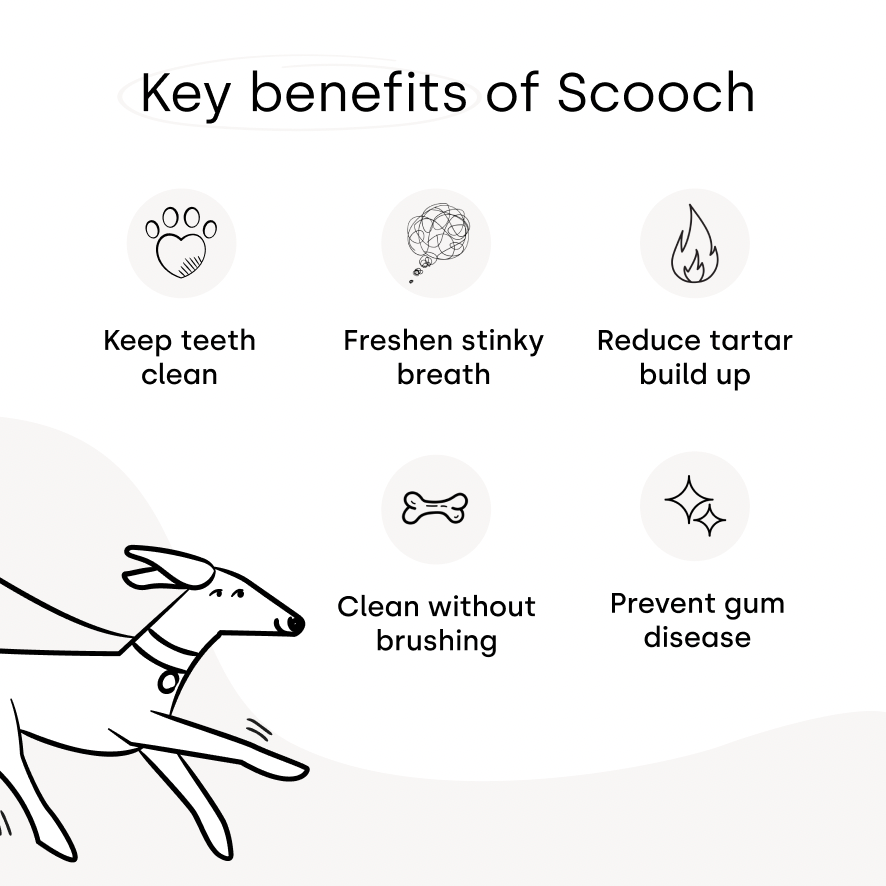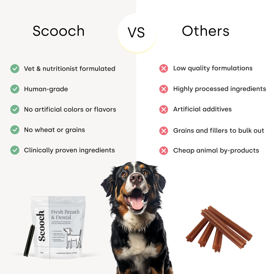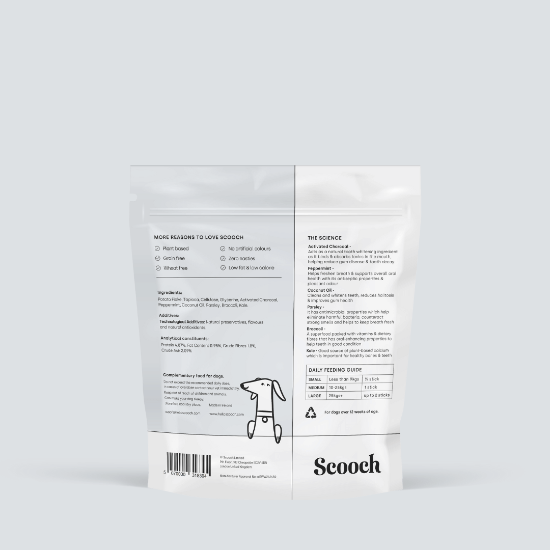 DescriptionScooch’s Dental sticks have been vet formulated to provide a clinically proven blend of ingredients to help make stinky breath and dental issues a thing of the past! From activated charcoal for tooth whitening, through to kale, broccoli and parsley for anti-microbial properties to eliminate harmful bacteria and keep teeth clean.The ingredients in these tasty daily chews are 100% natural, human grade, hypoallergenic and low fat to provide the best quality for your dog.