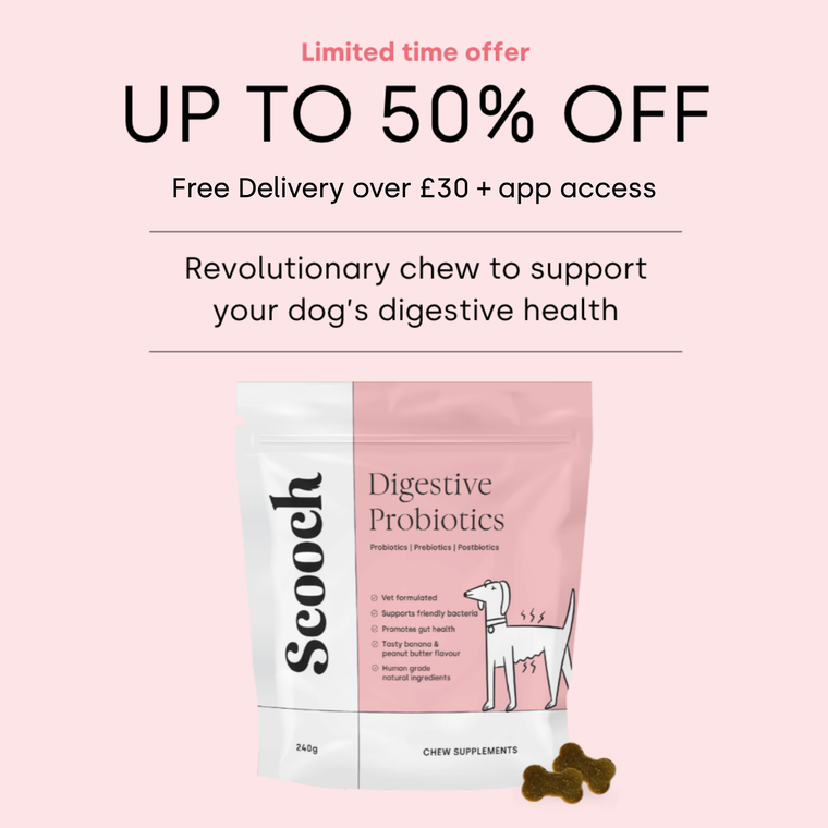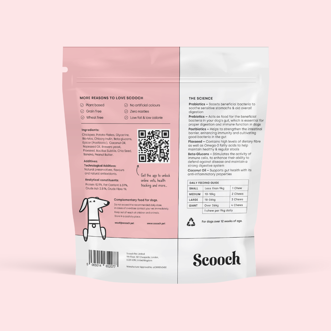 Scooch’s Digestive Probiotic chews have been vet formulated to provide a clinically proven blend of probiotics, postbiotics and prebiotics to help balance gut flora and boost digestion. The ingredients in these tasty daily chews are 100% natural, human grade, plant-based, hypoallergenic and low fat to provide the best quality for your dog.