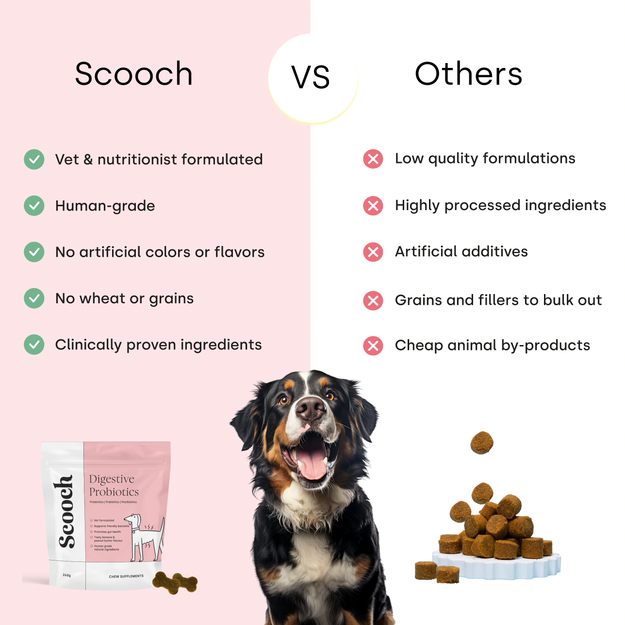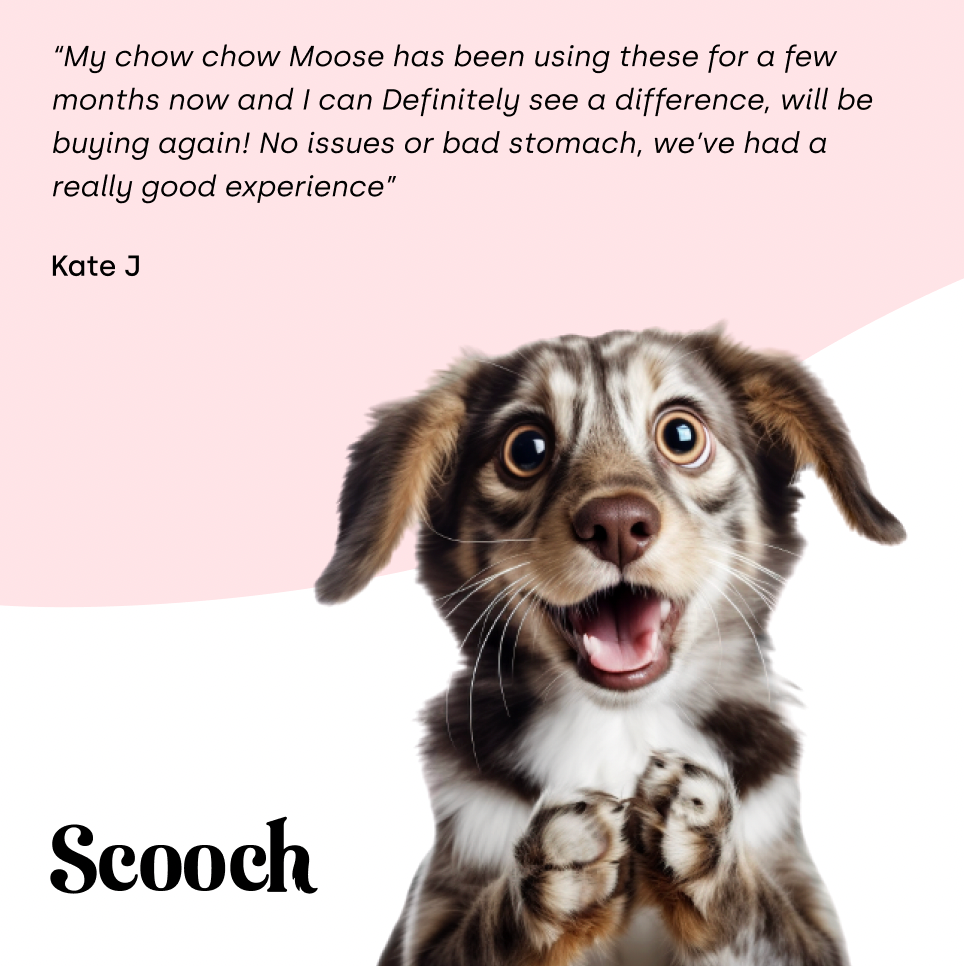 We love this question! Scooch supplements are not only vet-formulated and packed with clinically proven ingredients to actually make a difference, but each chew is also human grade, hypoallergenic and free of all nasties to ensure the highest quality is there for our dogs. Not to mention our focus on sustainability to protect the planet our dogs love so much, with all supplements being meat-free and wrapped up in eco-friendly, recyclable packaging.
