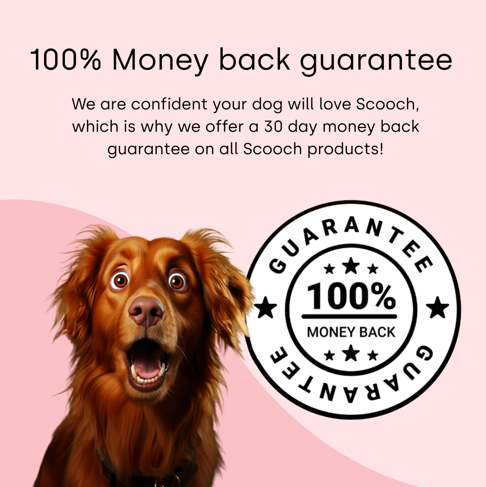 We're so confident your dog will love Scooch that we offer a no hassle, 30 day money back guarantee upon receipt of your order. You can try the product for 30 days, if you are not satisfied with the results we will refund your original purchase amount for the product ordered, as long as you have informed us within 30 days of order receipt. Simply reach out to our friendly team at woof@scooch.pet.