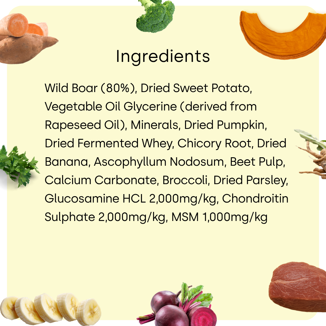 Wild Boar (80%), Dried Sweet Potato, Vegetable Oil Glycerine (derived from Rapeseed Oil), Minerals, Dried Pumpkin, Dried Fermented Whey, Chicory Root, Dried Banana, Ascophyllum Nodosum, Beet Pulp, Calcium Carbonate, Broccoli, Dried Parsley, Glucosamine HCL 2,000mg/kg, Chondroitin Sulphate 2,000mg/kg, MSM 1,000mg/kg -