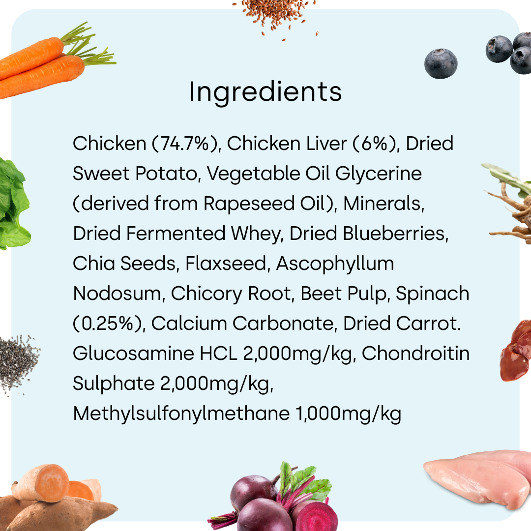 IngredientsPotato Flake, Tapioca, Cellulose, Chickpea, Coconut Oil, Glycerine, Pumpkin Seed, Apple, Kale, Yeast Products.