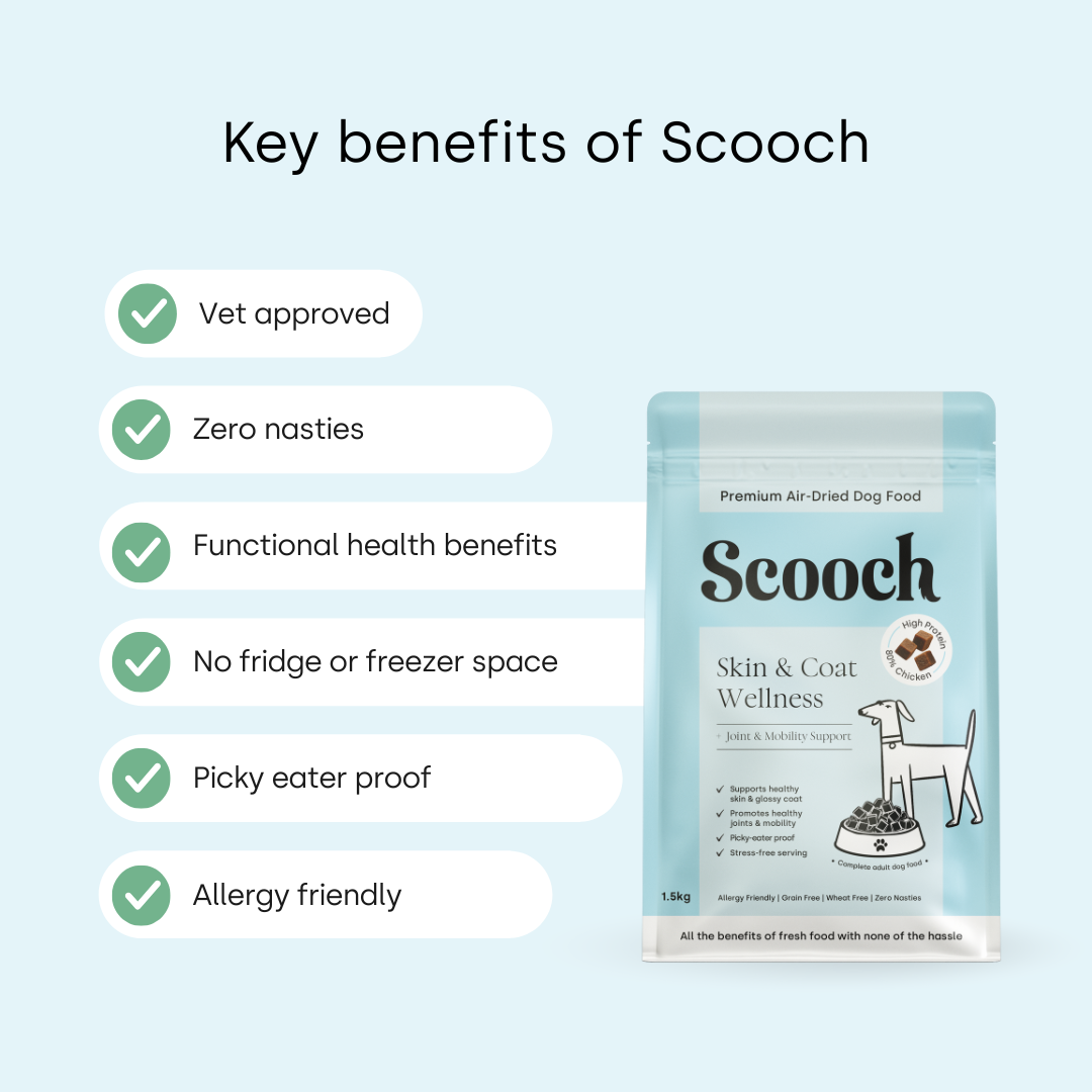 DescriptionScooch’s superfood training treats have been vet formulated to provide a clinically proven blend of ingredients to help make training sessions go the extra mile, supporting their immune system, digestion and skin health.Not to mention keeping their weight in check with their low fat & calorie ingredients. Which are of course, 100% natural, human grade and hypoallergenic to provide the best quality for your dog.