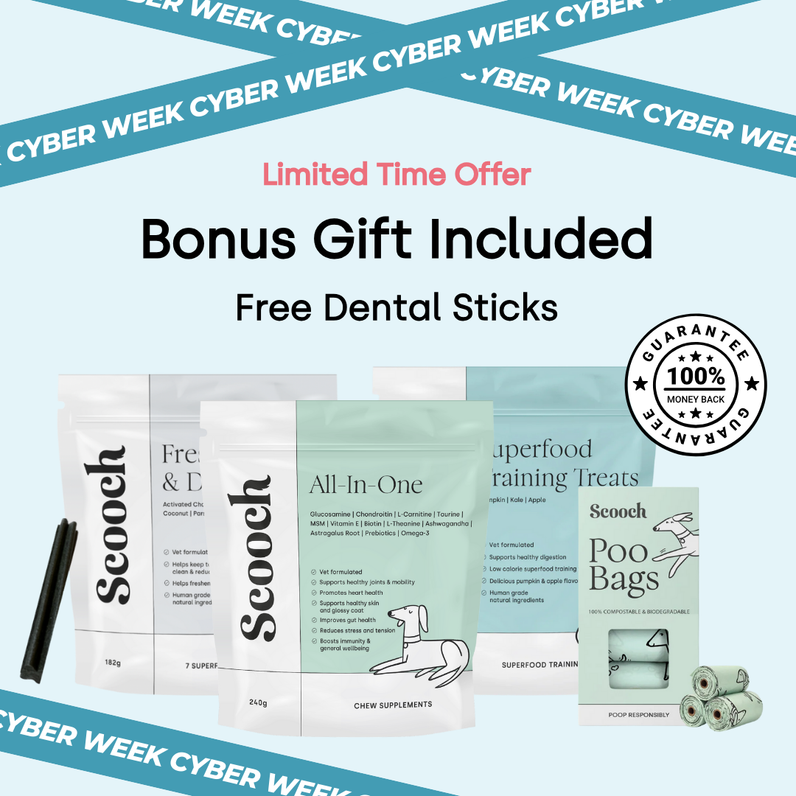 Fetch all the vet-formulated essentials your dog needs in one bundle. From our best-selling human grade multi-supplement chew to cover your pup from snoot to tail, through to natural dental sticks to prevent gum disease & freshen breath, low-calorie superfood training treats and durable, planet-friendly poop bags.